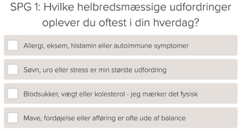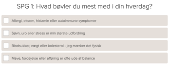 Quizzen er baseret på udvalgte elementer fra vores Funktionel Medicin MSQ (Medical Symptoms Questionnaire) og giver, ud fra dine egne svar, en indikation af din sundhedsprofil.