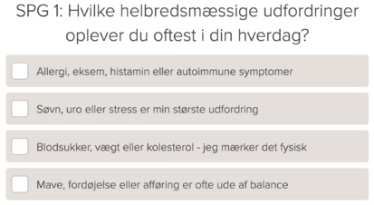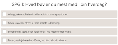 Quizzen er baseret på udvalgte elementer fra vores Funktionel Medicin MSQ (Medical Symptoms Questionnaire) og giver, ud fra dine egne svar, en indikation af din sundhedsprofil.